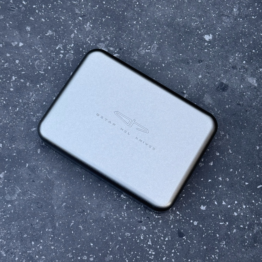 - Eleganckie pudełko aluminiowe z tłoczonym na górnym wieczku logiem Ostap Hel Knives.