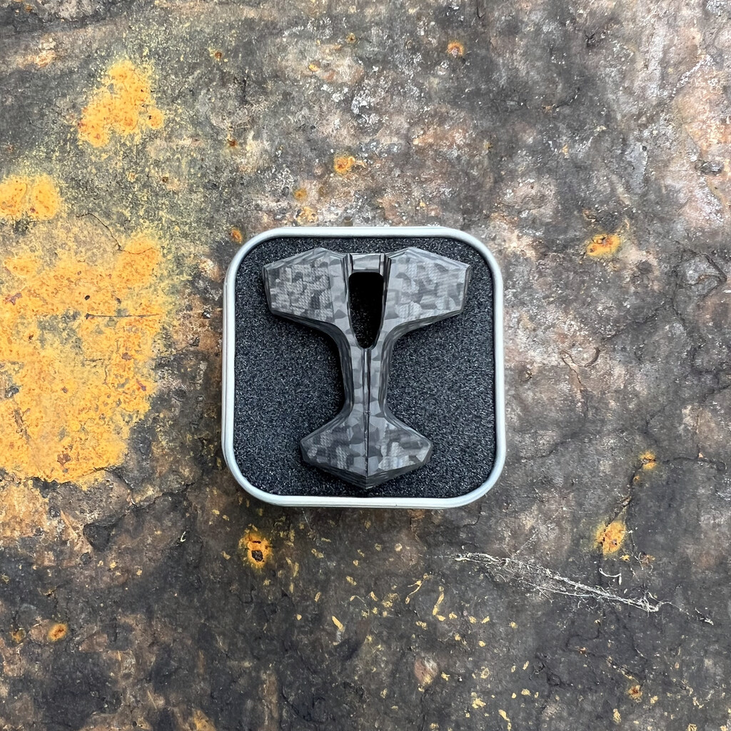 Ozdoba Wikinga, zawieszka z ekskluzywnego włókna węglowego, wisior na szyję, worry stone, gadżet EDC, stylowa ozdoba, niecodzienna biżuteria, gadżet pamiątkowy! Wiele funkcji ale jedyny niepowtarzalny Mjolnir II bezpośrednio z pracowni jednego z najbardziej utalentowanych polskich projektantów poruszających się w świecie noży i narzędzi EDC. Ostap Hel Knives bo o nim mowa, to wizytówka przedsiębiorczości i produktywności, której autorski projekt masz okazję w tej chwili lustrować!