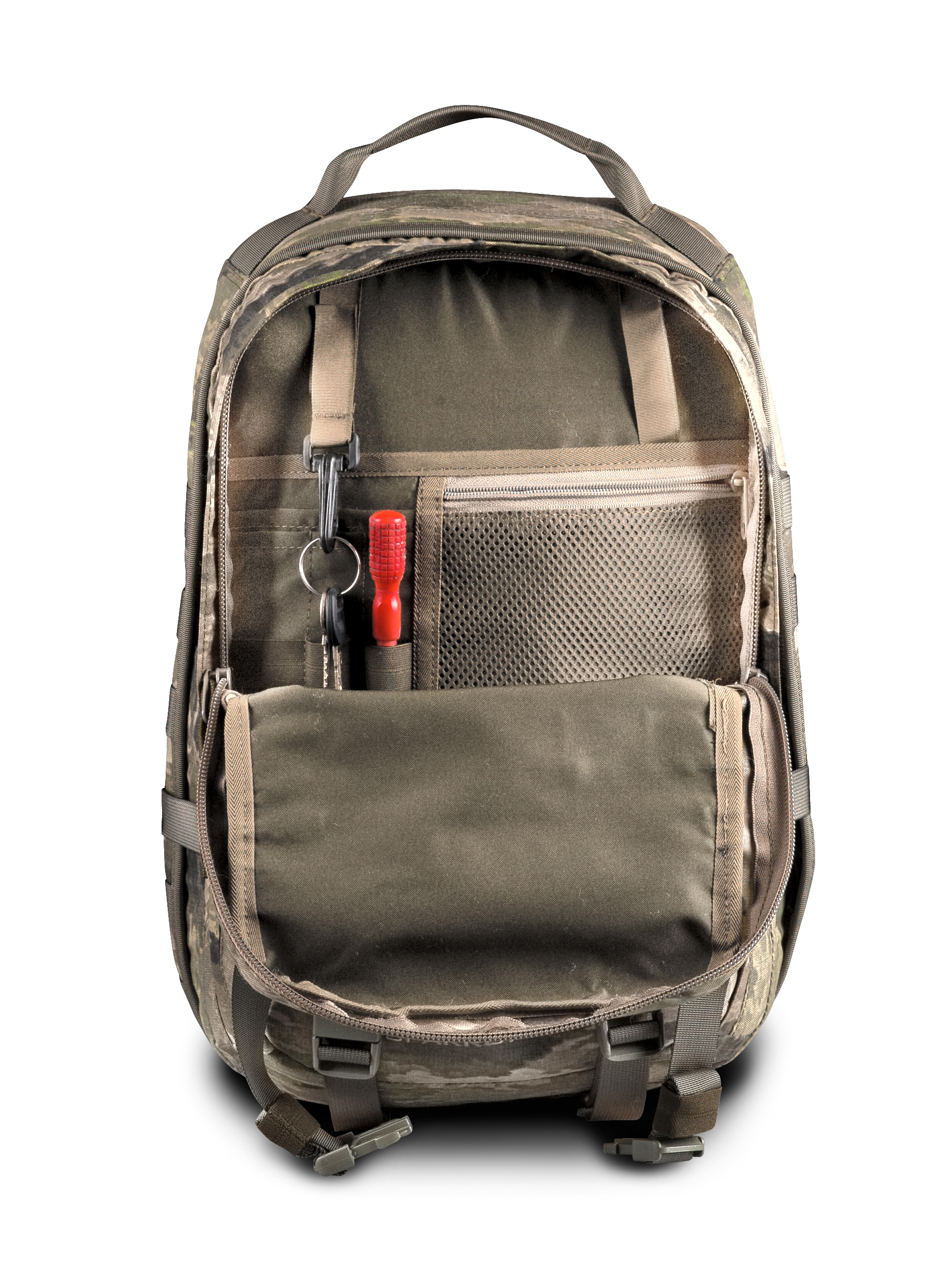 Ten zamykany na zamki błyskawiczne plecak militarno–survivalowy o pojemności 30 l. zaopatrzony jest w systemowy układ taśm MOLLE, dużą ilość przegród i kieszeni.