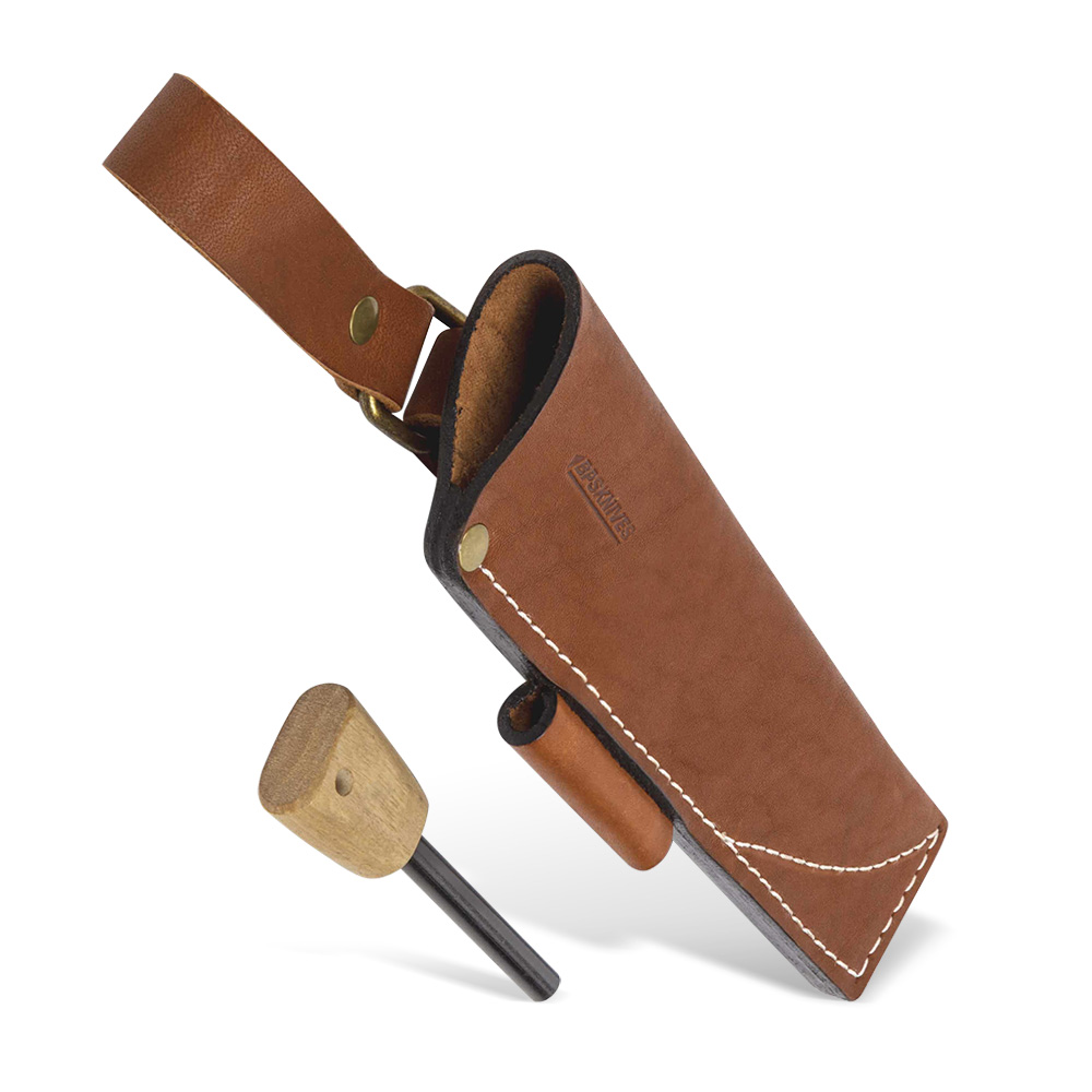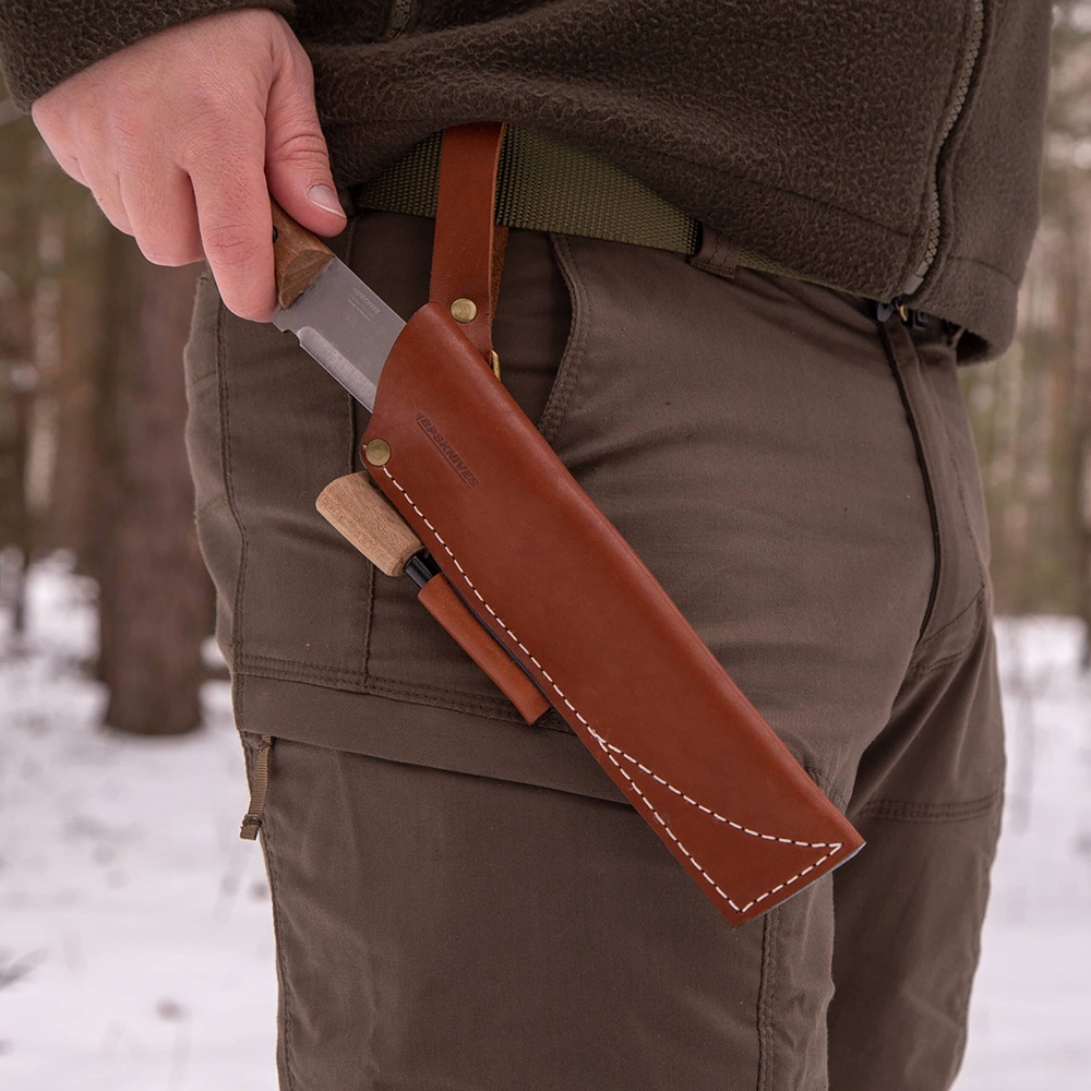 Pochwa skórzana BPS Knives na nóż SH07 Brązowa uniwersalna z krzesiwem to wygodne i pewne przenoszenie noża z głownią stałą.