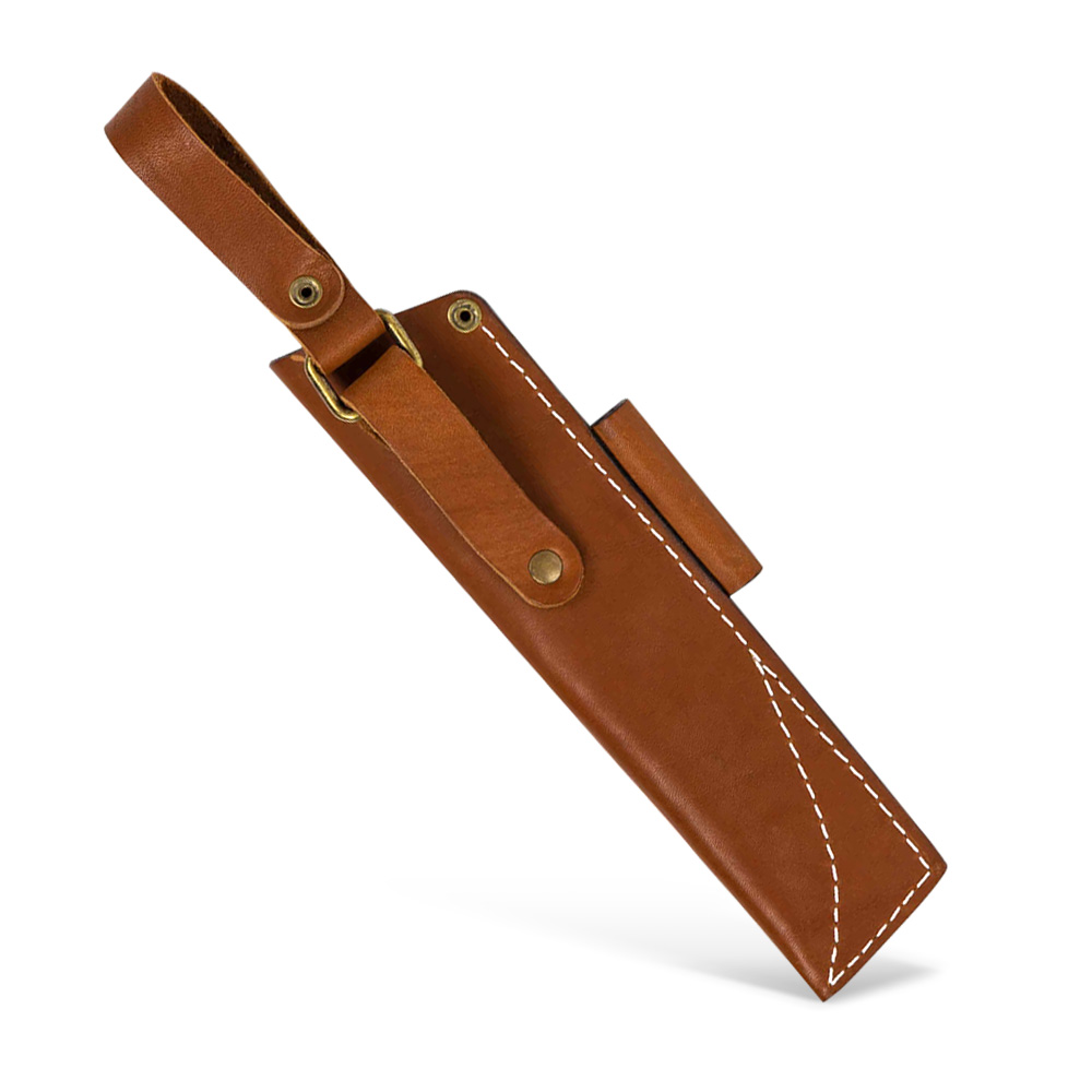 Pochwa skórzana BPS Knives na nóż SH07 Brązowa uniwersalna z krzesiwem przeznaczona została do przenoszenia noży z głownią stałą. Wykonana została z grubej naturalnej skóry (3 mm) zdobionej przeszyciami. Pochwa ma wysoki profil i chowa w sobie część rękojeści by lepiej zabezpieczać nóż przed wypadnięciem. Mocowana jest tradycyjnie do pasa w pozycji pionowej (tzw Dangler). Pasuje do większości noży z głownią stałą o długości całkowitej około 210 – 260 mm. Pochwa wyposażona jest w szlufkę z krzesiwem.