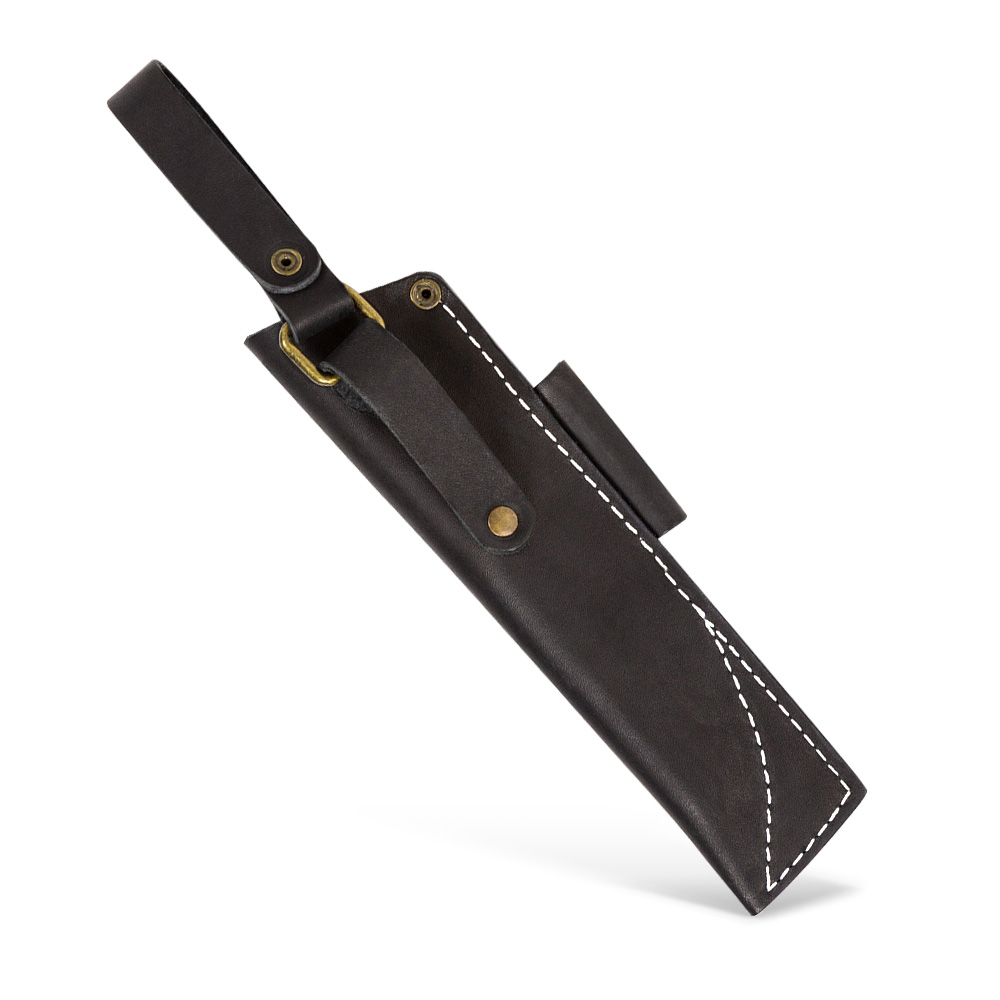Pochwa skórzana BPS Knives na nóż SH07 Czarna uniwersalna z krzesiwem przeznaczona została do przenoszenia noży z głownią stałą. Wykonana została z grubej naturalnej skóry (3 mm) zdobionej przeszyciami. Pochwa ma wysoki profil i chowa w sobie część rękojeści by lepiej zabezpieczać nóż przed wypadnięciem. Mocowana jest tradycyjnie do pasa w pozycji pionowej (tzw Dangler). Pasuje do większości noży z głownią stałą o długości całkowitej około 210 – 260 mm. Pochwa wyposażona jest w szlufkę z krzesiwem.