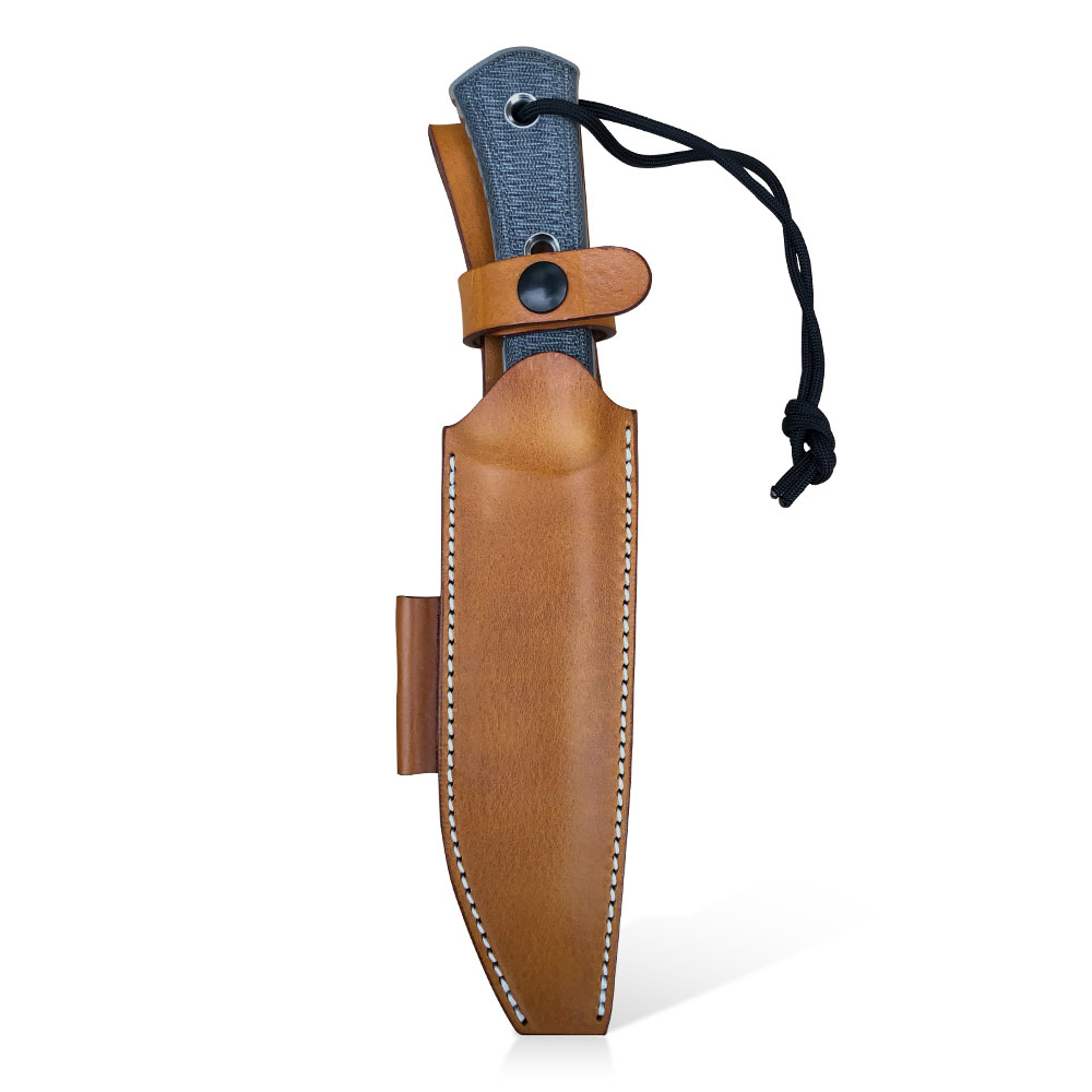 Pochwa posiada dużą przelotkę na przypięcie do paska. Nóż przed wypadnięciem zabezpiecza szlufka z masywnym zatrzaskiem umiejscowiona na wysokości rękojeści. Wzdłuż krawędzi bocznej doszyto kieszonkę na krzesiwo.