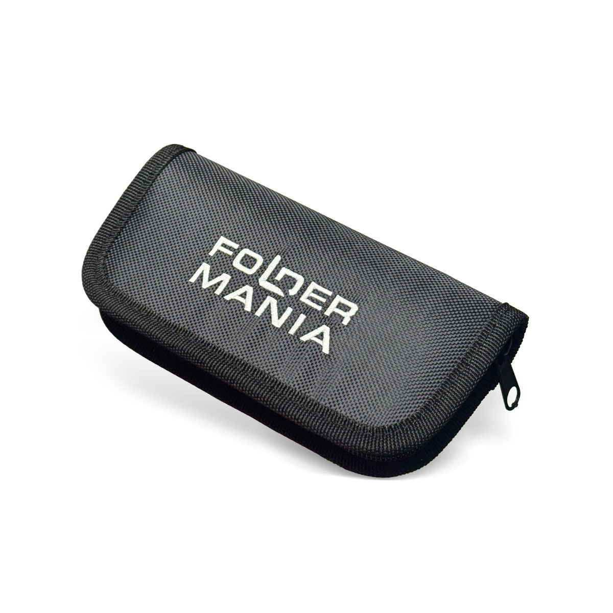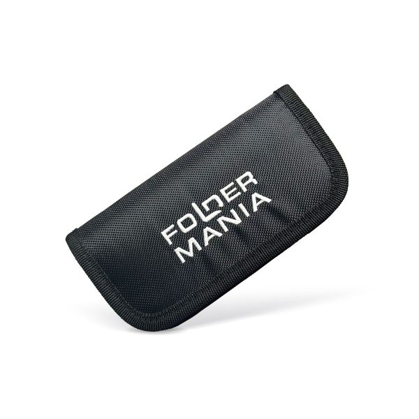 Pokrowiec Foldermania z wytrzymałego nylonu posiadający kieszenie na dwa noże. Pokrowiec zasuwany na suwak błyskawiczny.