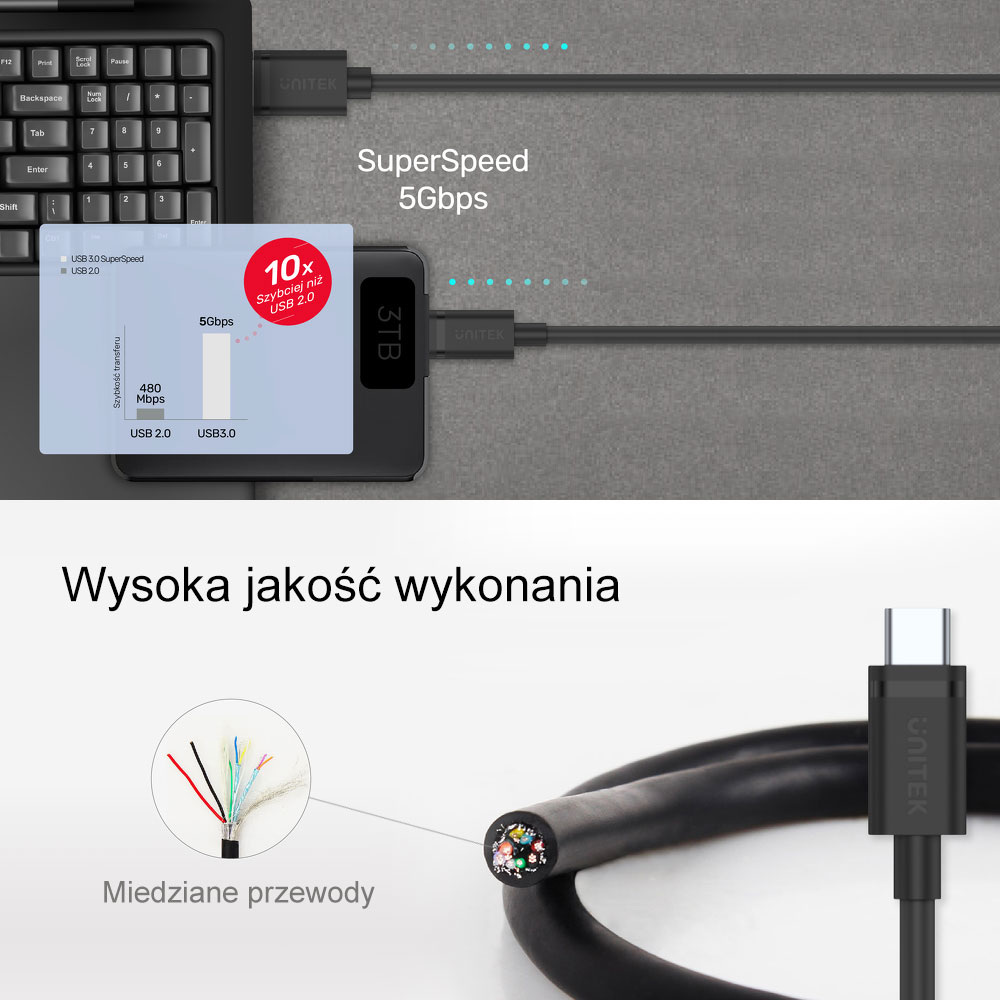 Przewód Unitek USB 3.1 Typ A-Typ C M-M 0,25 m przewodzi prąd o maksymalnym natężeniu 2A a przesyłanie danych jest zgodne ze specyfikacją USB 3.1 Gen1 i odbywa się z prędkością 5 Gbps.