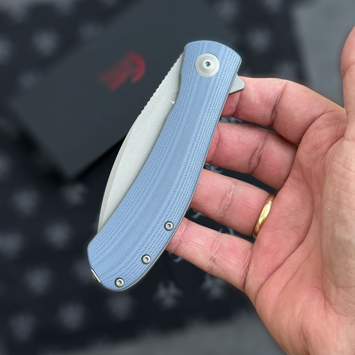 - Stal: D2 (59-61 HRC), szare wykończenie: dark bead blast finish