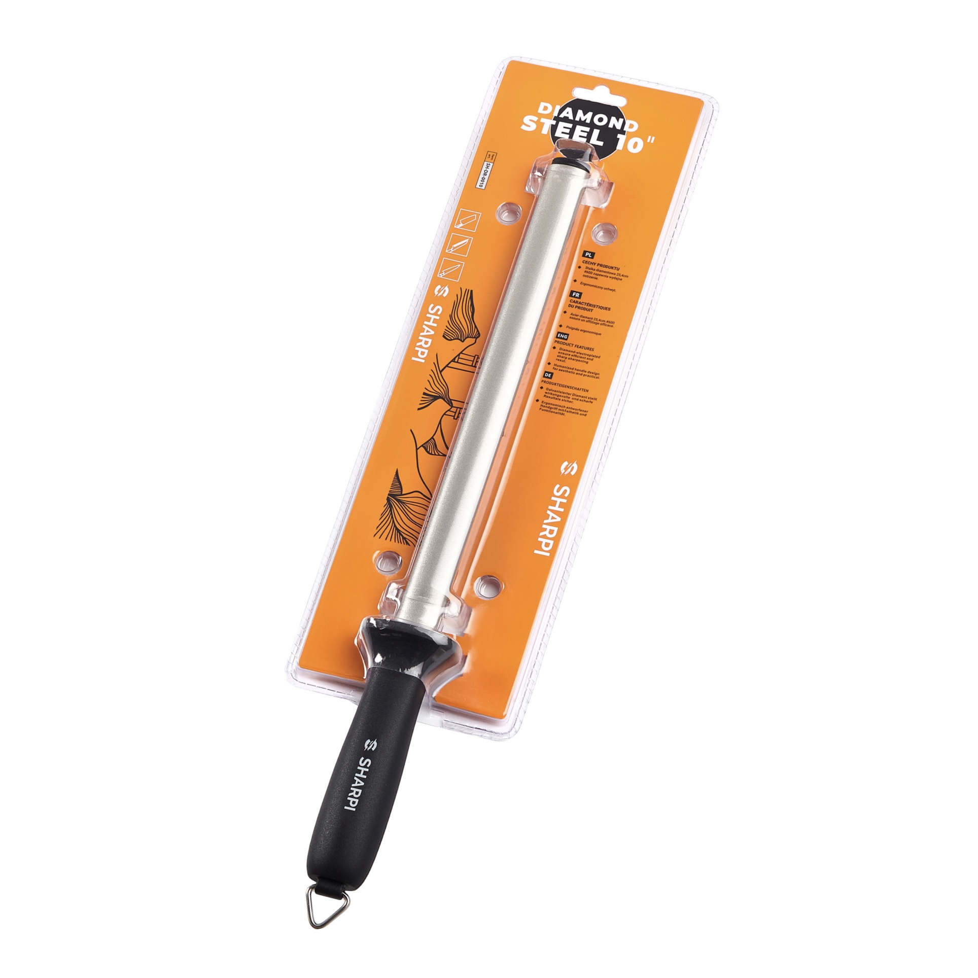 Musak diamentowy Sharpi o długości 25 cm przeznaczony jest do regularnego ostrzenia noży kuchennych, zwłaszcza wykonanych z twardej stali. Sprawdzi się zarówno w kuchni domowej, jak i profesjonalnej. Gradacja #600 zapewnia efektywne ostrzenie i przywracanie ostrości roboczej noża.