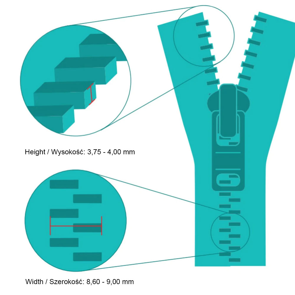 - Przeznaczenie: zamki błyskawiczne standard z tworzyw sztucznych i metalu w rozmiarze XXL (8,6-9,0 mm / 3,75-4,0 mm)