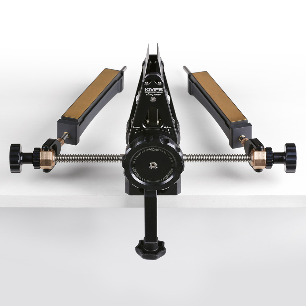 KMFS RIVAL MOA21 to profesjonalny system ostrzenia dla każdego z nas. Łatwość, z jaką można regulować kąt ostrzenia jest już ogromnym plusem, ale KMFS z modelem MOA21 poszedł dużo dalej w optymalizacji ostrzenia. Więc co w tym takiego genialnego? System jest dwustronny, więc możemy ostrzyć obie strony krawędzi tnącej jednocześnie a do tego posiada opatentowany mechanizm zaciskowy. Zacisk można otworzyć lub zamknąć, obracając duże pokrętło z przodu systemu ostrzenia. Bez kłopotów z kluczami imbusowymi lub ciężkimi dźwigniami. Łatwość i szybkość, z jaką można zaciskać lub odblokowywać nóż, odróżnia ten system ostrzenia od reszty. System ostrzenia wykonany jest z jednego kawałka aluminium ERGAL ENAW 7075 T651. Dzięki temu system jest lekki, ale także bardzo sztywny, a zatem bardzo precyzyjny. Czarna powłoka, oprócz atrakcyjnego wyglądu, zapewnia ochronę przed korozją. Sporo newralgicznych elementów gwintowanych systemu wykonano z brązu dla poprawienia ich żywotności.