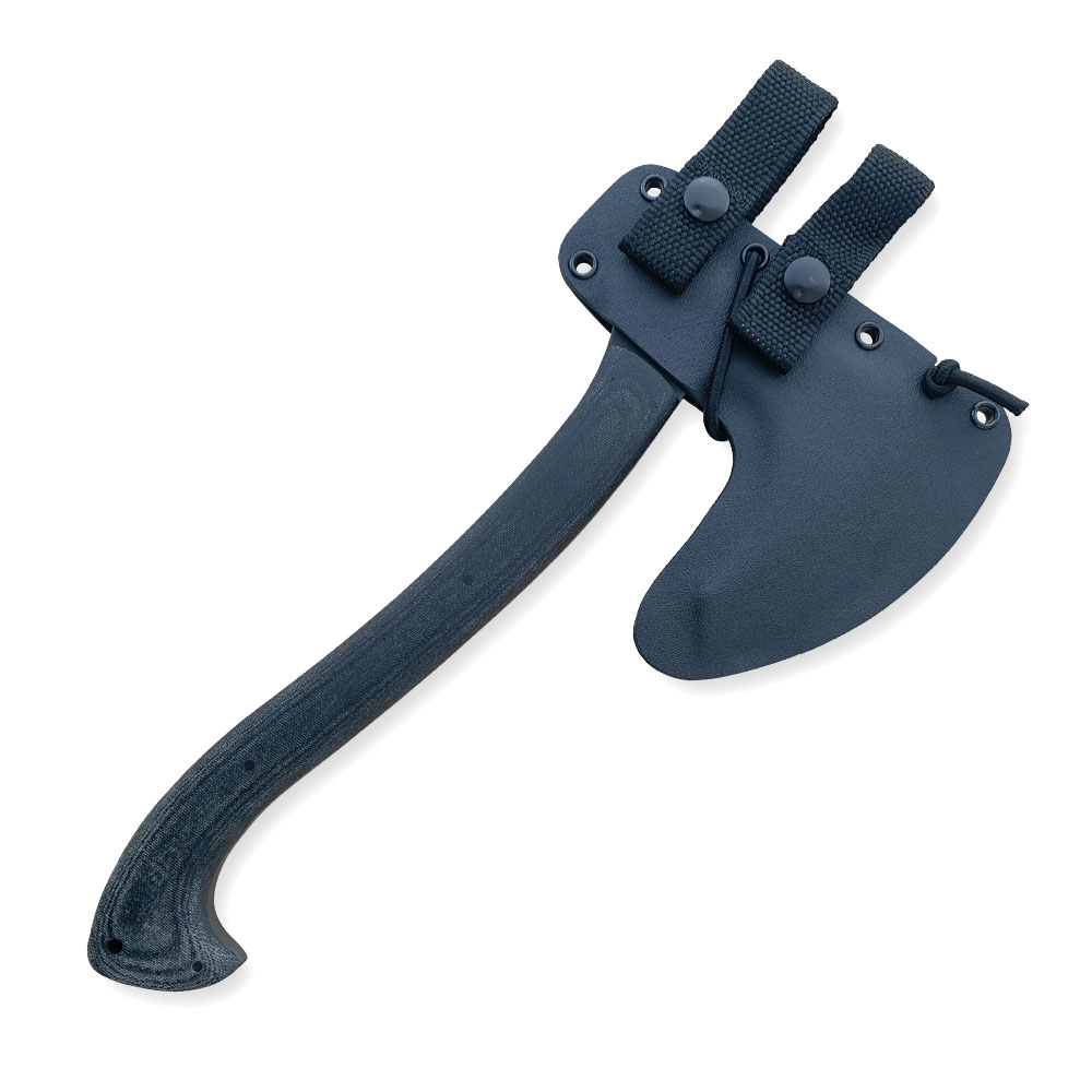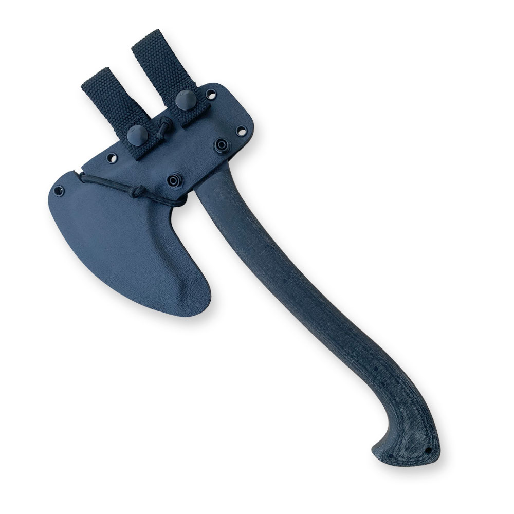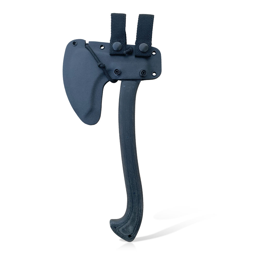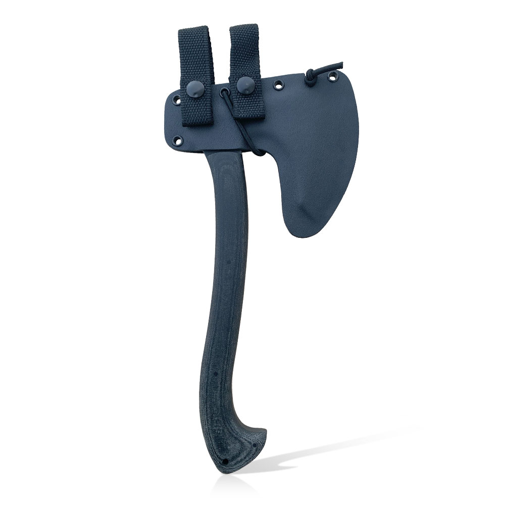 W zestawie z toporem otrzymujemy kaburę z ręcznie formowanego tworzywa kydex w kolorze czarnym. Kydex cechuje się wysoką odpornością na uderzenia, zarysowania, charakteryzuje się niską chłonnością wilgoci, odpornością na różnorodne warunki atmosferyczne oraz wiele środków chemicznych. Kabury z niego wykonane użytkujemy wygodnie i długotrwale. Kabura jest mocno dopasowana do topora i posiada dodatkowe zabezpieczenie przeciwko jego wypadnięciu w postaci elastycznej linki ciasno opinającej całość dookoła.