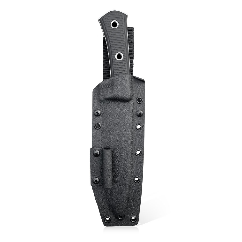 W zestawie z nożem otrzymujemy kaburę z ręcznie formowanego tworzywa Kydex, którą przytwierdzamy do paska za pomocą zrobionej z wytrzymałego nylonu o dużej gramaturze przelotki. Uchwyt z tego materiału daje elastyczność, która np. podczas przykucnięć czy schyleń układa się w sposób ograniczający czasami występujące uciążliwe ściśnięcia czy „przycięcia” ciała. Dla ułatwienia w wyjmowaniu noża, który bardzo dobrze opina ciasno dopasowane tworzywo zaplanowano podporę na kciuk, dzięki której nóż możemy wyjąć w sposób kontrolowany i bezpieczny. Sam Kydex to materiał bardzo wytrzymały, cechuje się wysoką odpornością na uderzenia, zarysowania, charakteryzuje się niską chłonnością wilgoci, odpornością na różnorodne warunki atmosferyczne oraz wiele środków chemicznych. Kabury z niego wykonane użytkujemy wygodnie i długotrwale. Kabura zaopatrzona została w piny przelotowe, do których można przypiąć np. uchwyt na krzesiwo (znajduje się w zestawie i jest oryginalnie podpięty) lub użyć ich do jej zamocowania na plecaku, elemencie uprzęży czy rozwiązaniu typu molle.