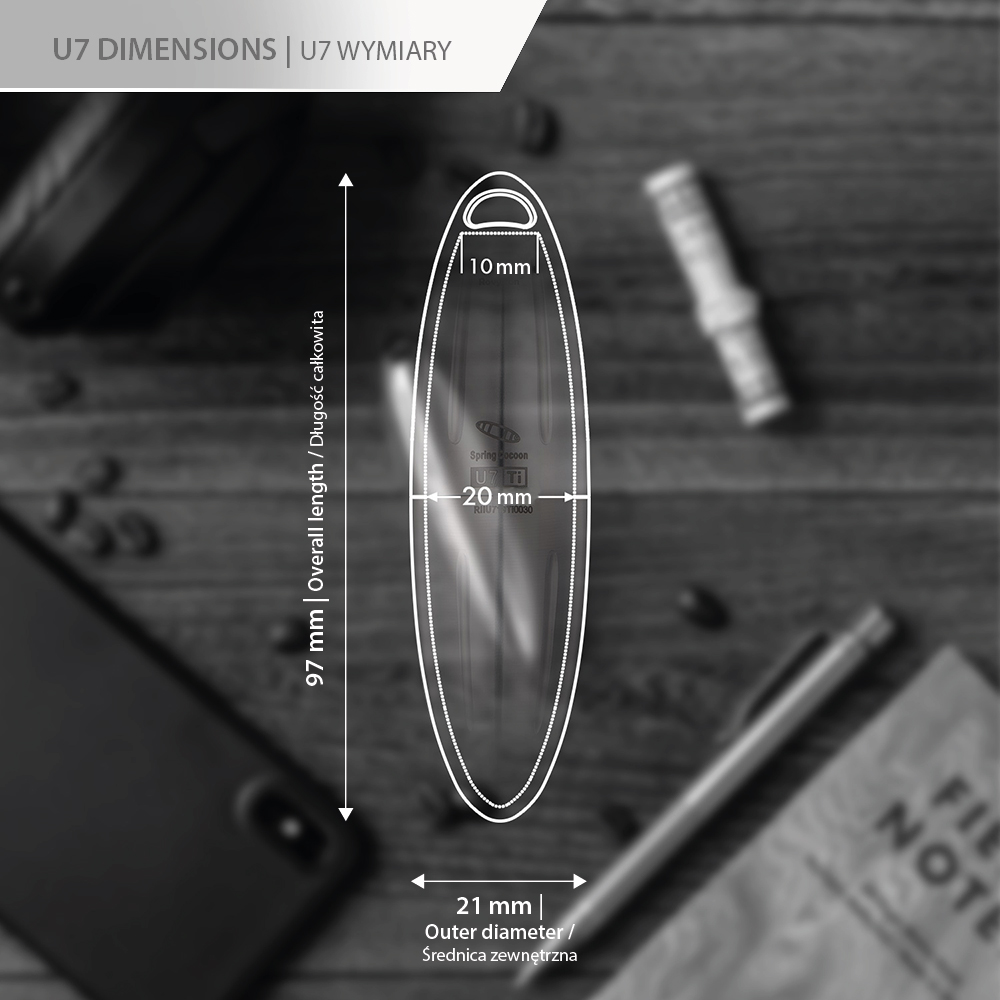 Tytanowa konstrukcja ochroni przed mechanicznym uszkodzeniem zawartości, uszczelnienie i idealne spasowanie przed jej zamoczeniem. Otwór na linkę pozwoli na przytroczenie i zabezpieczenie całości do plecaka, torby, nerki, czy też kółka na klucze. Optymalny rozmiar pozwoli na przechowywanie zapasowej baterii (np. baterii AA, CR123 i 16340), małej latarki (np. latarki typu brelok) i innych akcesoriów codziennego użytku. Kapsuła U7 może posłużyć na przechowanie żelaznego zapasu gotówki, czy też niezbędnych lekarstw.