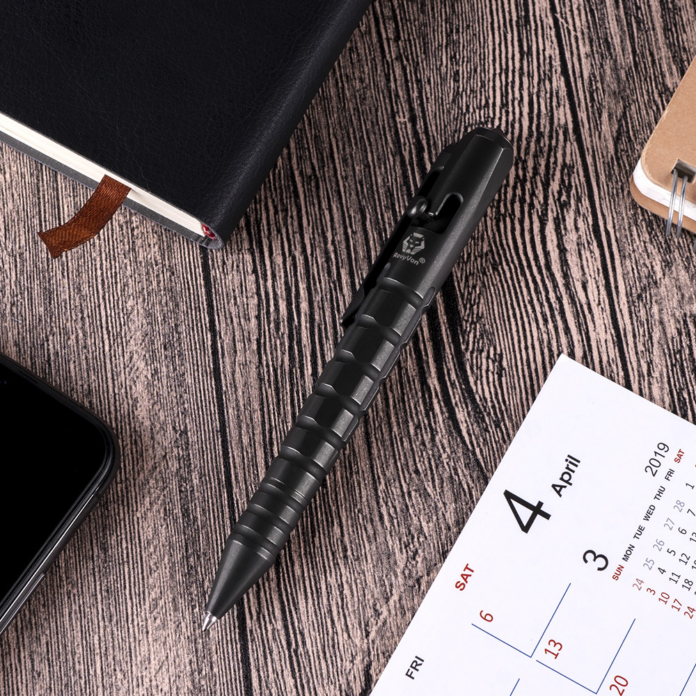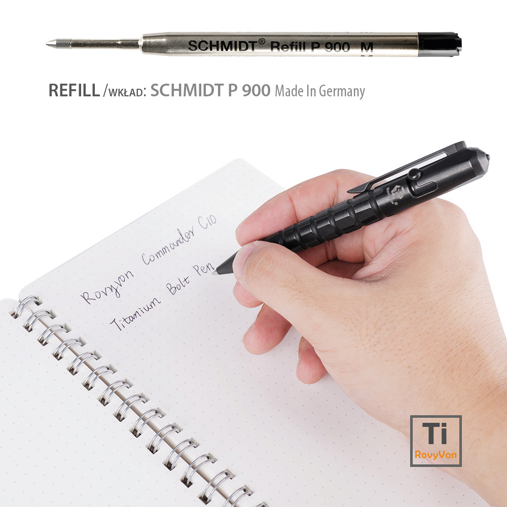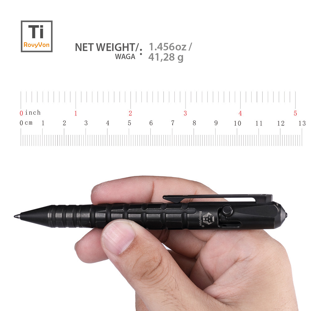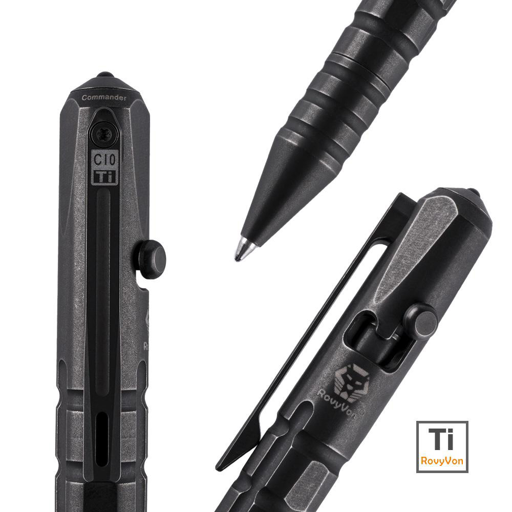 Tytanowy długopis taktyczny RovyVon Commander C10 Black PVD Ti Bolt Action Pen to nie jest zwykły artykuł piśmienniczy. Długopis jest świetnej jakości codziennym akcesorium o stylowym i dynamicznym wyglądzie. Prezentuje cechy taktyczne i militarne. Jego design odwołuje się do wyglądu granatu (żebrowanie). Nie dajmy się jednak zwieść. Commander C10 to przede wszystkim przyrząd do pisania dla ludzi ceniących niecodzienną stylistykę i energiczny sznyt w swoim sprzęcie. Pięknie pisze, a w dodatku posiada wybijak do szyb, który pomoże w wydostaniu się z zakleszczonego auta, lub dostaniu do jego wnętrza, aby uwolnić pozostawione wewnątrz dziecko lub zwierzątko domowe. Może być również stosowany do samoobrony.