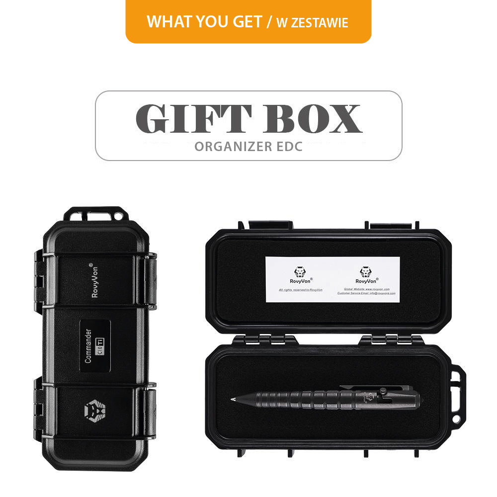 Długopis dostarczany jest z organizerem EDC RovyVon (RX10 do oddzielnego kupienia tutaj) wykonanym z wytrzymałego poliwęglanu. Organizer może służyć do przechowywania długopisu, można go używać jako piórnika lub pojemniczka do innych akcesoriów, takich jak latarka, nóż składany itd. Wymiary organizera: 178 x 82 x 34 mm.
