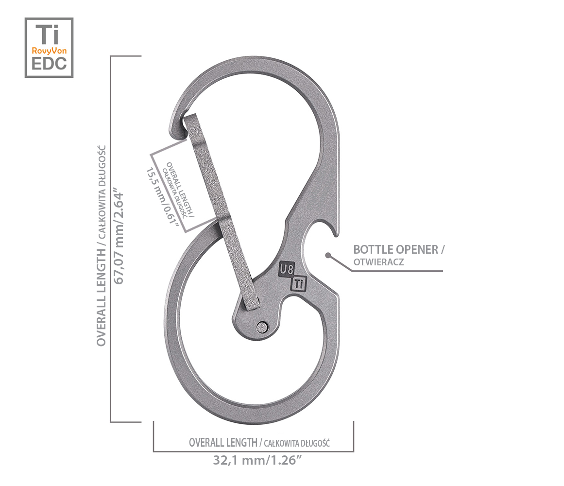 Posiada możliwość szybkiego zwalniania doczepionego elementu (quick-release). Karabińczyk został wyposażony w otwieracz do butelek.NAZWA: RovyVon® U8MATERIAŁ: TytanWYMIARY: 67,07 x 32,01 x 3,8 mmWAGA: 13,2 g