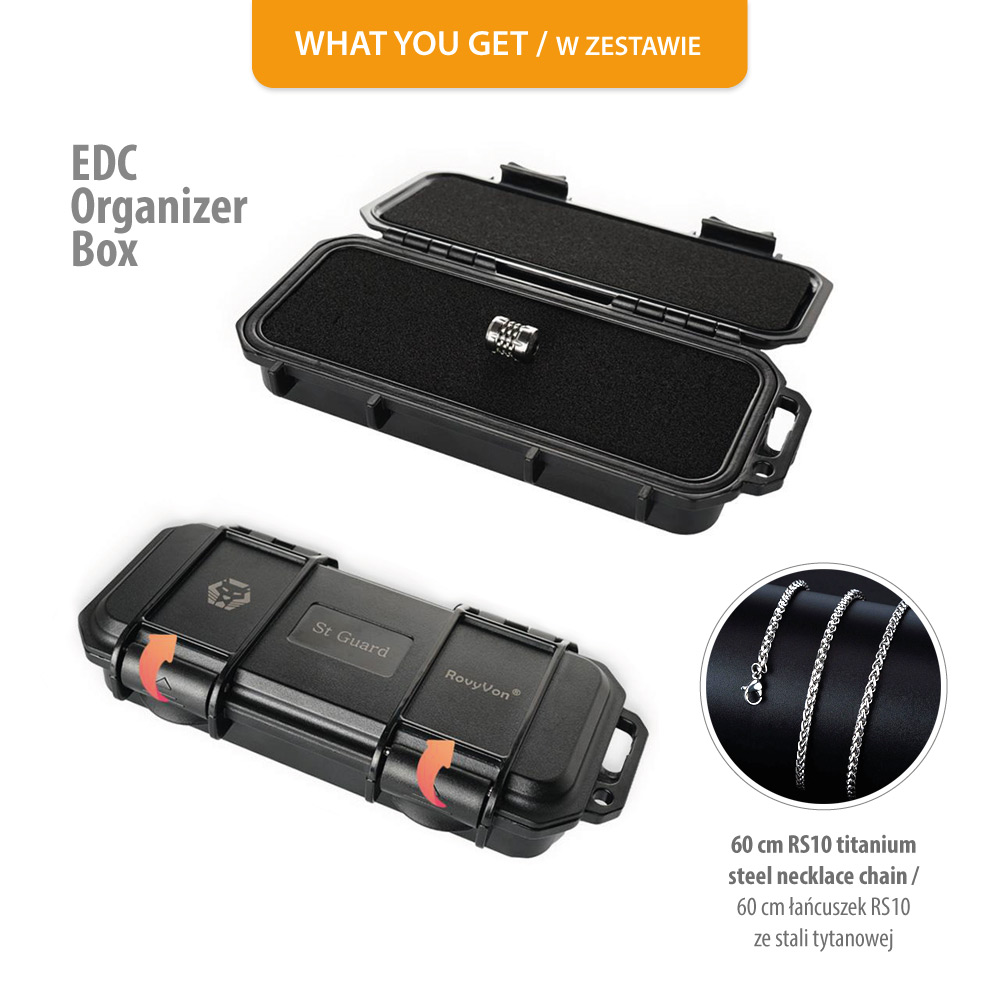 Organizer EDC RovyVon, z wytrzymałego poliwęglanu do przechowywania koralika, łańcuszka lub innych niezałączonych w prezentowanym zestawie akcesoriów, takich jak latarka, nóż składany, długopis itd. Wymiary organizera: 178 x 82 x 34 mm. Więcej o cechach samego organizera można znaleźć TUTAJ.W ZESTAWIE: Koralik tytanowyW ZESTAWIE: Łańcuszek ze stali nierdzewnejW ZESTAWIE: Organizer EDCW ZESTAWIE: Certyfikat