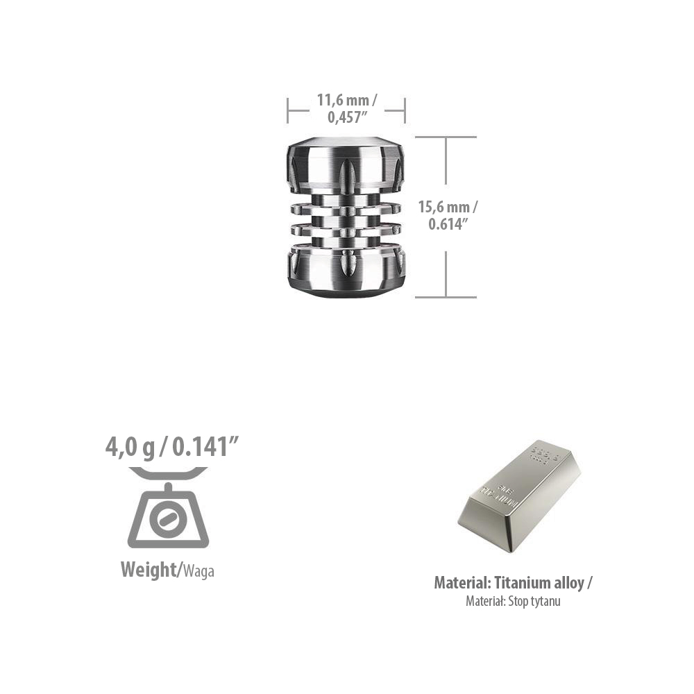 Tytanowy koralik Walker wykonany ze stopu tytanu o kształcie poprawiającym chwytność. Koralik jest rozkręcany i posiada 6 szczelin na laseczki trytu świecącego bez żadnego dodatkowego źródła zasilania (wymiary szczeliny to 1,5 mm x 6 mm). W prezentowanej wersji koralika, laseczki trytu nie są dołączone.