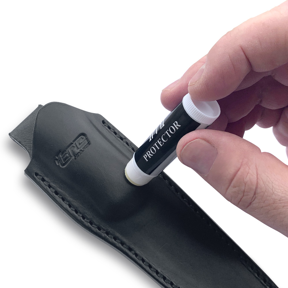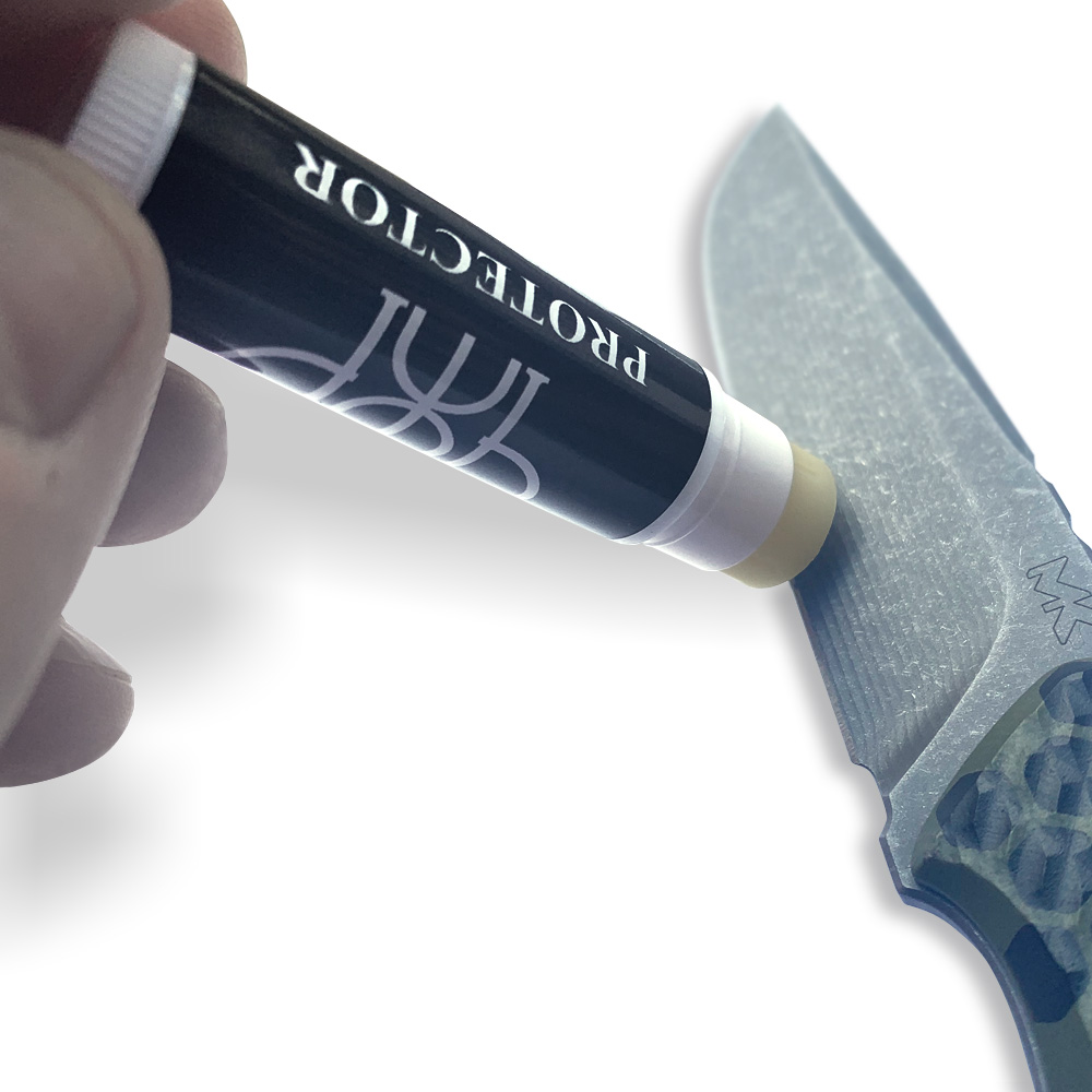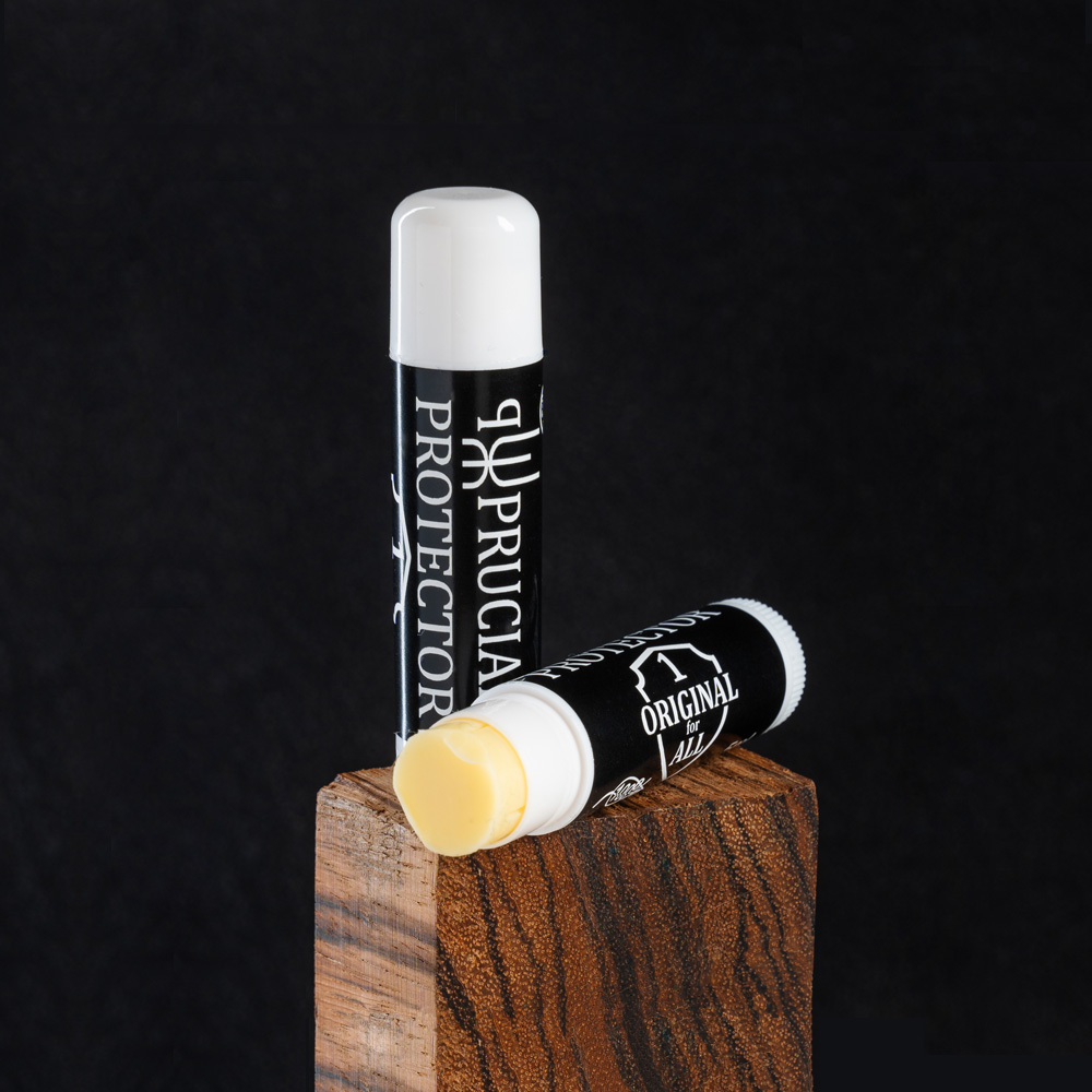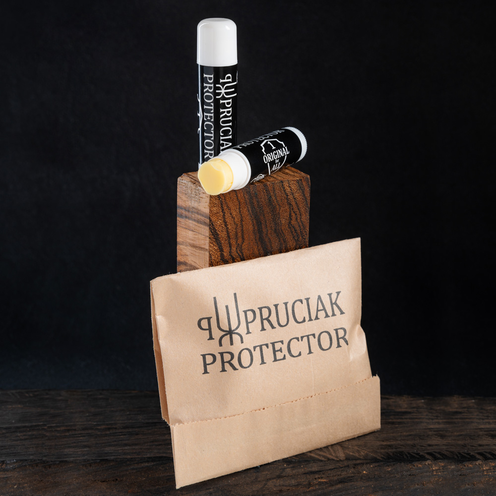Wosk do noży Pruciak Protector Original w sztyfcie opracowany przez Pawła Pruciaka. Autorska receptura do pielęgnacji i zabezpieczenia noża podana w formie wygodnego, kieszonkowego aplikatora o wielkości szminki do ust.