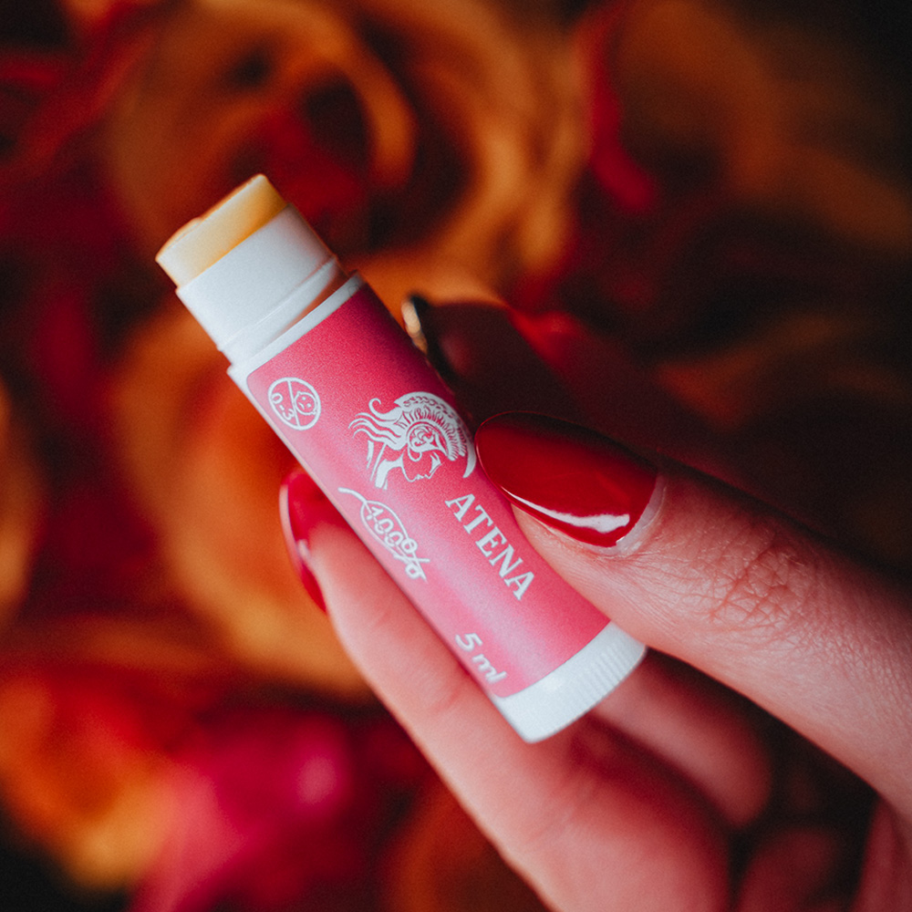 Atena dla łatwej identyfikacji ma etykietę w kolorze różowym i zawiera dodatek zapachowy. W trakcie użycia wyczuwalne są wydzielające się z wosku nuty zapachowe dzikiej róży, słodycz pomarańczy, aromat mięty pieprzowej.