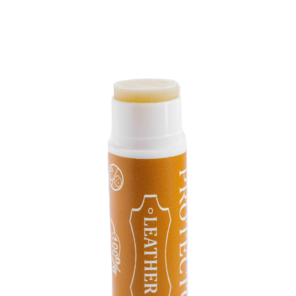 Wosk do noży Protector Leather w sztyfcie dla łatwej identyfikacji został opatrzony etykietą w brązowym kolorze.
