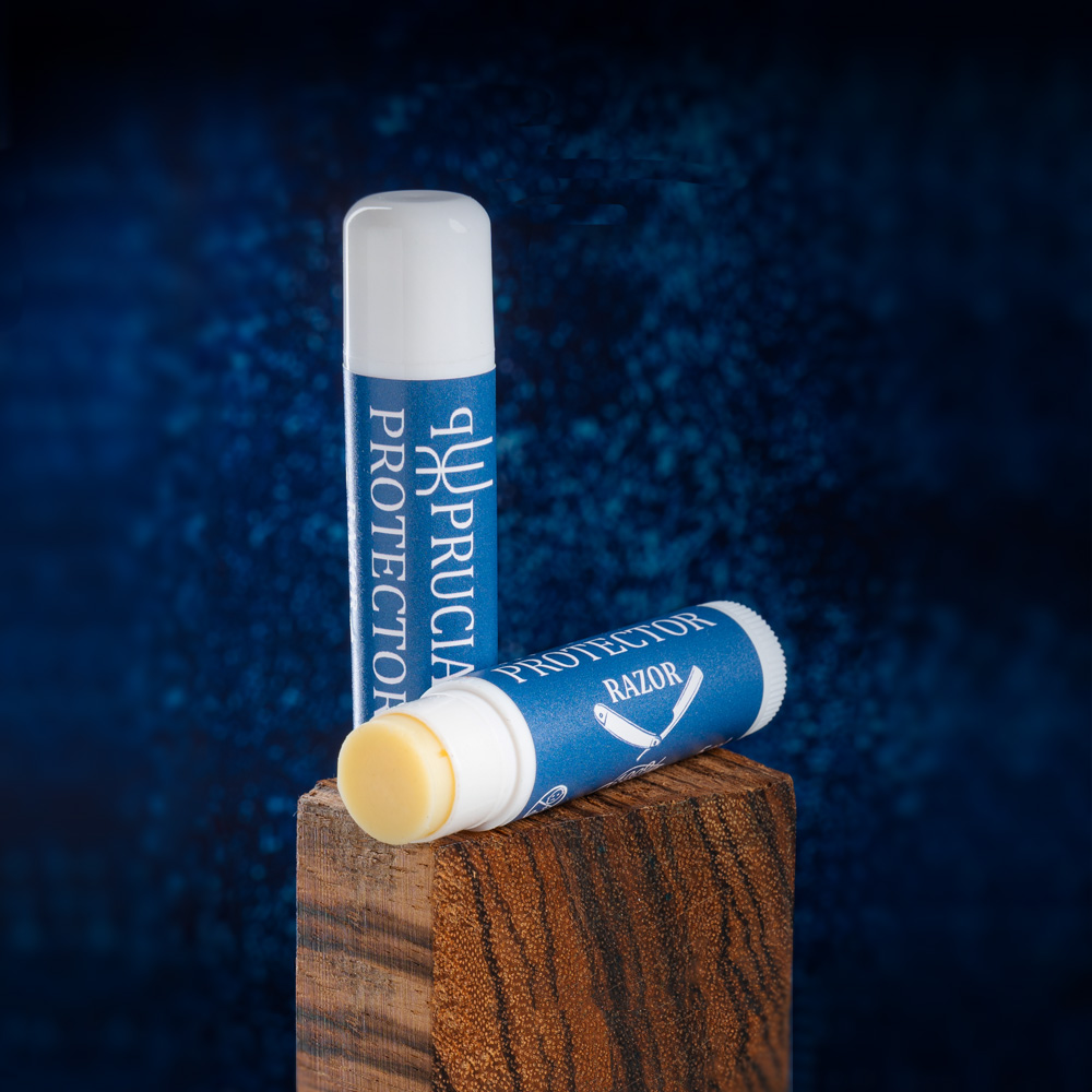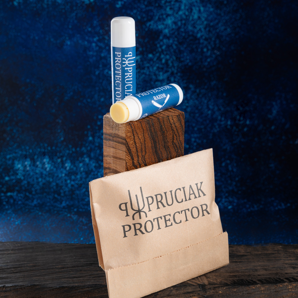 Wosk do stali Pruciak Protector Razor w sztyfcie opracowany został przez Pawła Pruciaka głównie do ochrony stali brzytew do golenia, ale świetnie sprawdzi się również do głowni folderów i scyzoryków. Autorska receptura do pielęgnacji i zabezpieczenia stali podana w formie wygodnego, kieszonkowego aplikatora o wielkości szminki do ust. Niejednokrotnie świetne brzytwy jest wykonane są ze stali „narzędziowej”, która potrafi rdzewieć. Nikt tego nie lubi. Wychodząc naprzeciw potrzebom użytkowników, powstał „Protector Razor”. Ten wosk w sztyfcie zabezpiecza brzytwy przed wilgocią, a co za tym idzie zapobiega przed powstawaniem rdzy. Razor świetnie też zaimpregnuje drewniane okładziny lub nada blask innym materiałom.