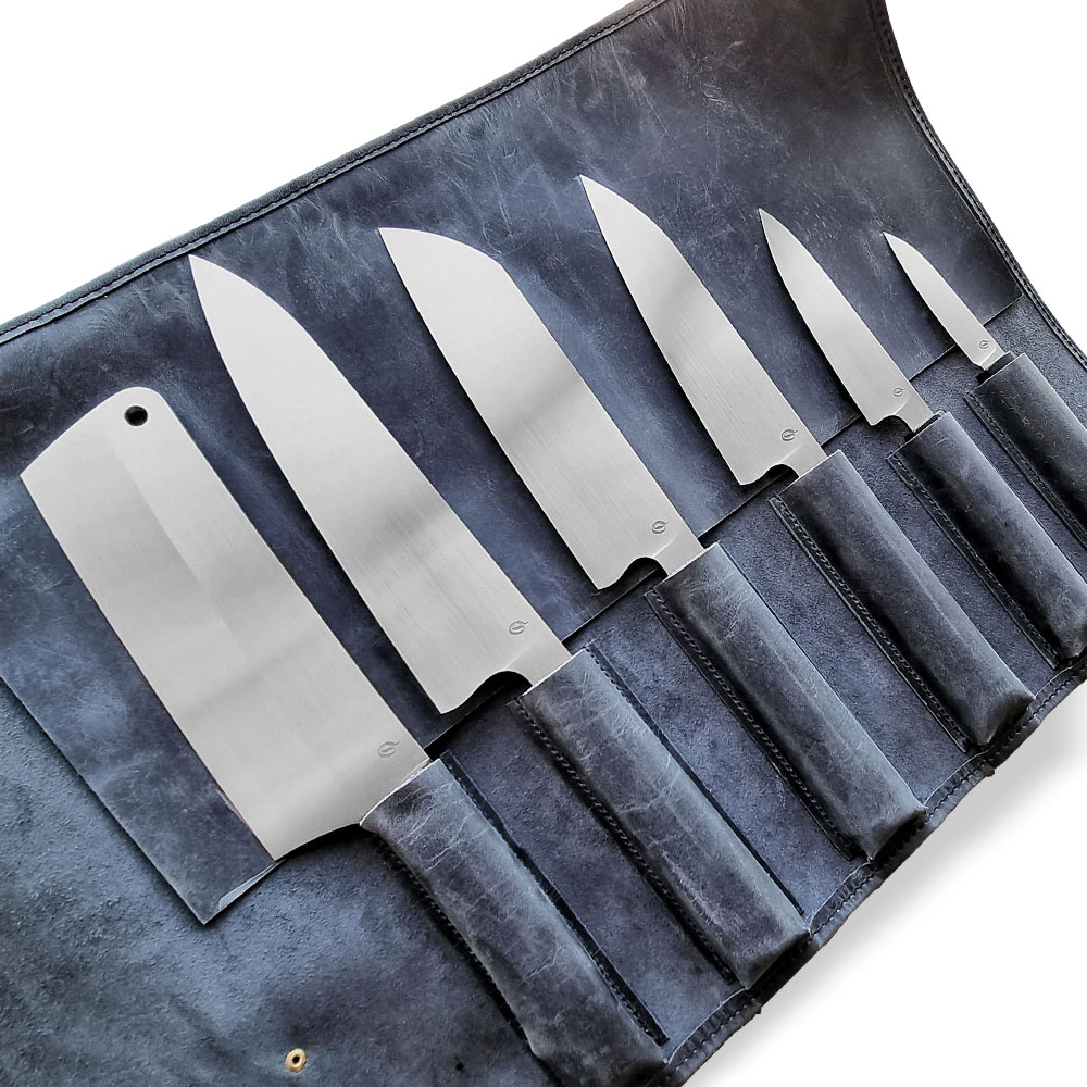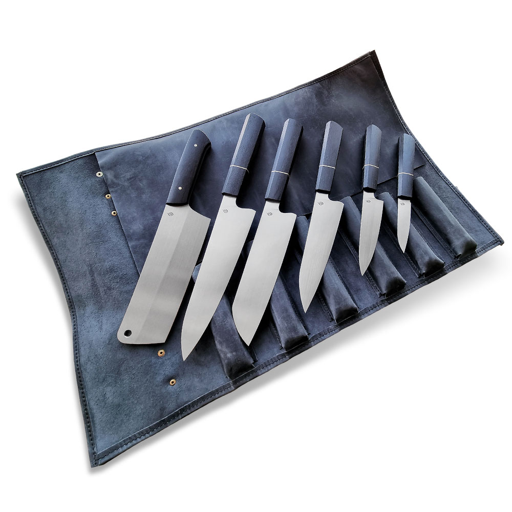 Oryginalnie w zestawie otrzymujemy drewniany stojak. Istnieje możliwość zamiany stojaka na skórzany organizer, tzw. rallbag mieszczący wszystkie noże. Jest to rozwiązanie dla szefów kuchni, czy osób przemieszczających się ze swoim sprzętem. Etui jest wykonane ze skóry naturalnej, zwijalne i zamykane na paski. Etui posiada uchwyt do łatwego przenoszenia. Organizacja zawartości jest bardzo łatwa. Każdy nóż ma swoją przegródkę a ostrze zabezpieczone jest dodatkową, okrywającą ją płachtą skóry, co sprawia że po zwinięciu ostrza nie obijają się o siebie i tym samym nie uszkadzają.NAZWA: Zestaw 6 noży kuchennych