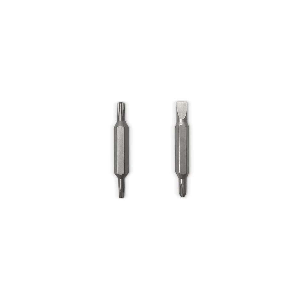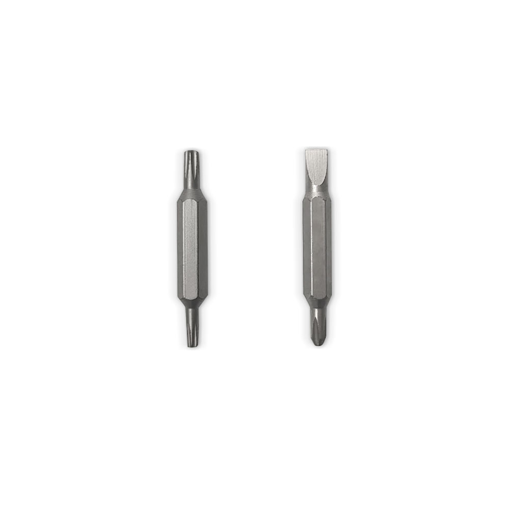 • dwustronny, wykonany ze stali S2 wkrętak z końcówkami Torx w rozmiarach T6 i T8 powszechnie występującymi w konstrukcji noży składanych (folderów),