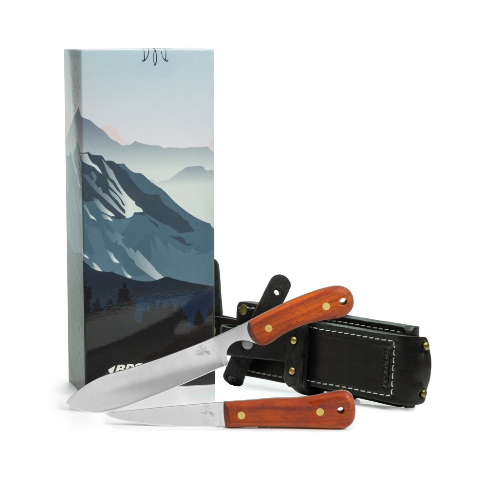 Zestaw Dwóch Noży Myśliwskich BPS Knives Hunter Set FB by Fred Perrin powstały w wyniku kooperacji designersko-produkcyjnej. Za projekt odpowiada francuski knifemaker, a za produkcją stoi ukraiński producent. Efektem tej współpracy jest zestaw dwóch noży myśliwskich ze stali nierdzewnej 5Cr14MoV w komplecie z mieszczącą obydwa noże na raz i troczoną do pasa skórzaną pochwą.